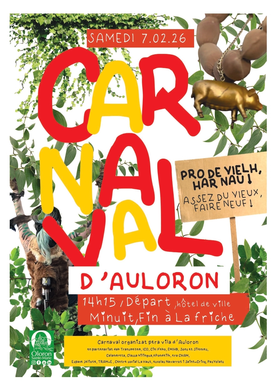 Pour la 4° année consécutive, le Carnaval est mis en scène par la Compagnie oloronaise Ifébo, qui détourne les codes carnavalesques pour bousculer l'actualité et offrir un grand moment festif et populaire. Au programme : remise des clés, procès de Carnaval et crémation de San Pançard. Carnaval électoral 2026 : San Pançard se rêve maire avec un programme gourmand - tripes, saucisses et Jurançon - mais une adversaire inattendue surgit : Carronha, entourée de ses êtres sauvages, porte un projet radicalement différent. La campagne promet d'être mouvementée, entre gendarmes inquiets, figures égocentrées et ours rugissants.