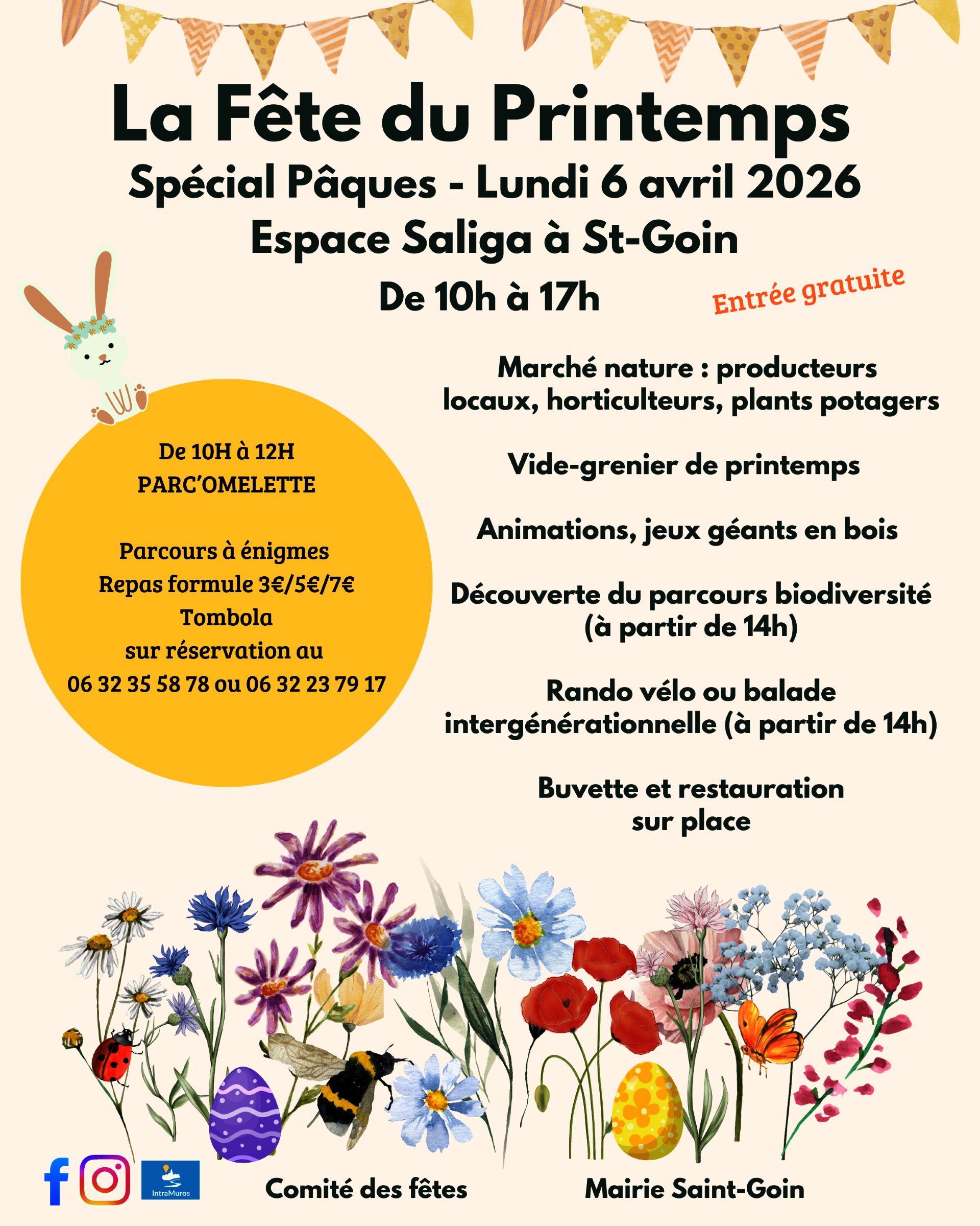 Marché nature, vide grenier de printemps, parc’omelette, animations et jeux géants en bois, rando vélos ou balade intergénérationnelle, découverte du parcours biodiversité organisé par le comité des fêtes de Saint-Goin.