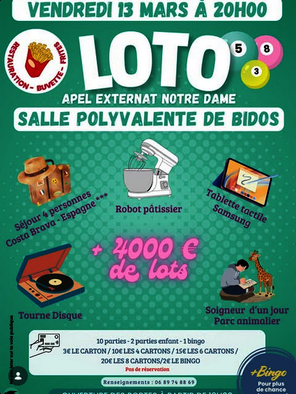 L'association des parents d'élèves de l'externat Notre Dame organise son loto. Plus de+ 4000€ de lots à gagner ! Séjour Costa Brava, Robot pâtissier, Tablette Samsung, Tourne-disque, activité Soigneur d’un jour...