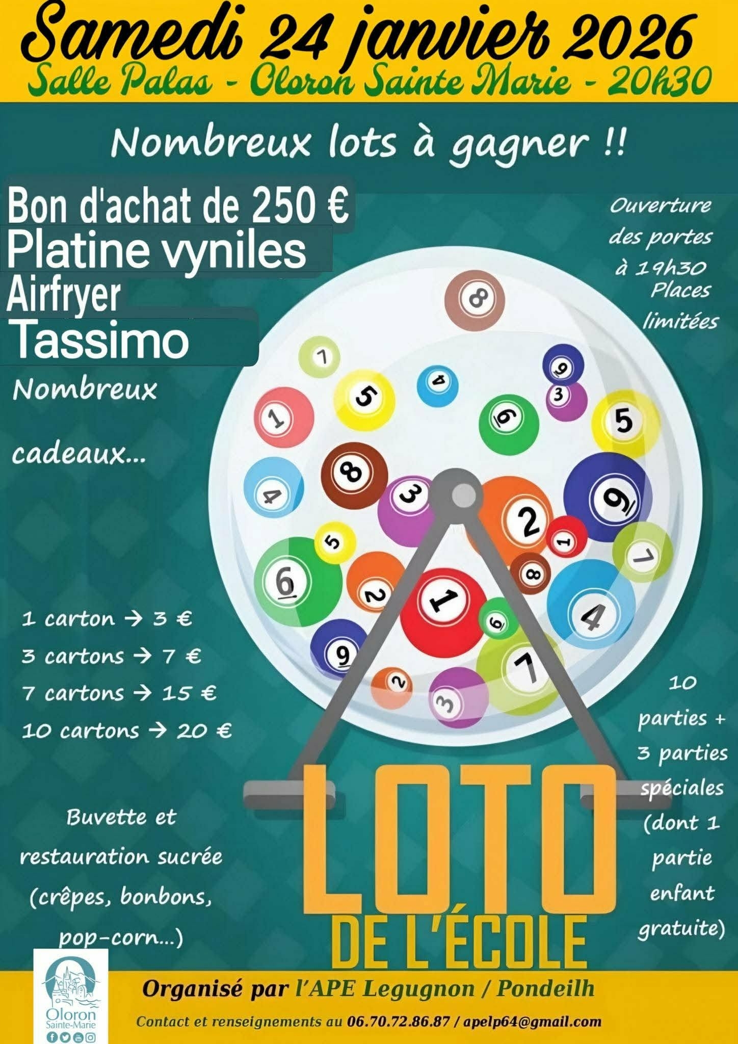 L'association des parents d'élèves de Légugnon/ Pondeilh organise leur loto, de nombreux lots à gagner ! Bon d'achat de 250€, platine vinyles, Airfryer, Tassimo etc... 10 parties + 3 parties spéciales (dont 1 partie enfant gratuite).