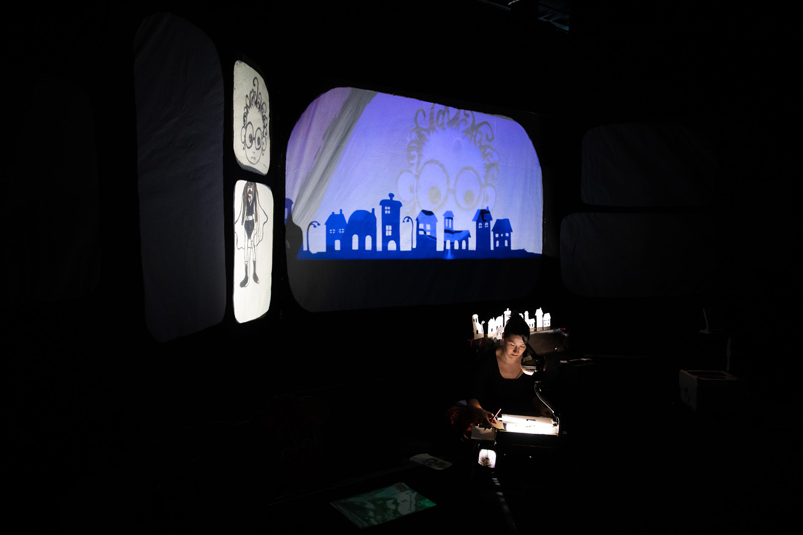 Grâce à un astucieux décor de toile divisé en bulles et au rythme d’une bande-son aux petits oignons, des marionnettes et images animées apparaissent comme dans une bande dessinée. Avec peu de mots, la comédienne manipule devant nous les objets et les ombres pour donner vie à cette histoire : le quotidien ennuyeux de Globule se joue en noir et blanc, tandis que ses fantaisies se parent de mille couleurs. Une véritable fête de l’imagination !