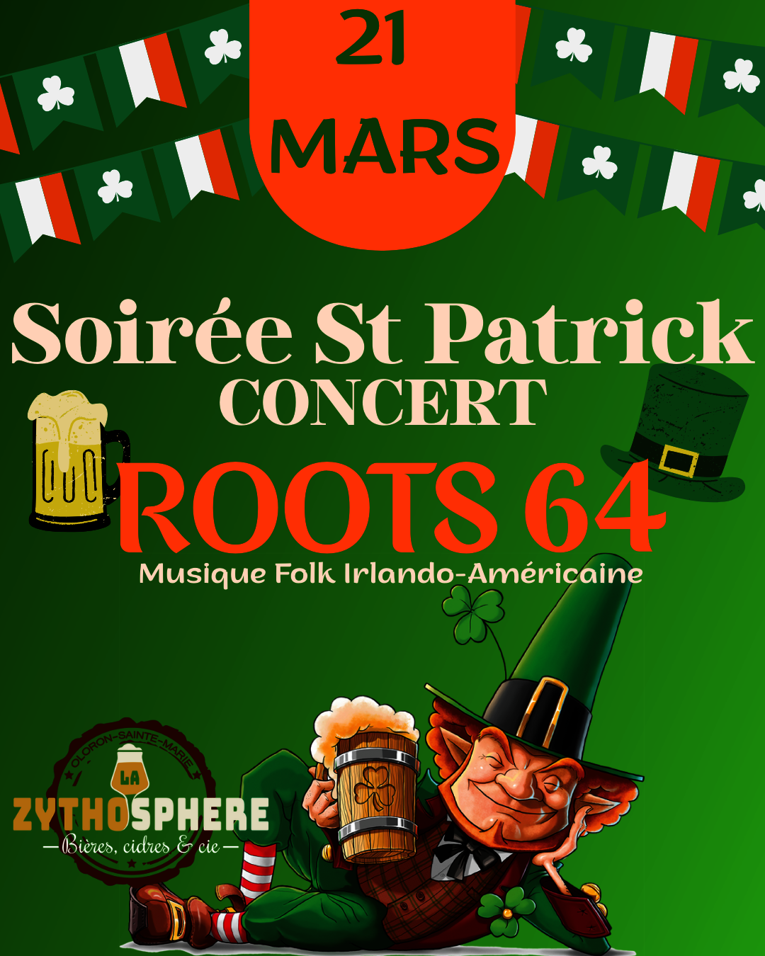 Concert OLORON-SAINTE-MARIE 31 Boulevard des Pyrénées21 mars 2026De 16h50 à 00h20Concert pour fêter la semaine de la St Patrick.Tarifs Entrée libre ContactLa Zythosphère+33 6 98 41 97 24contactlazythosphere.fr< Retour