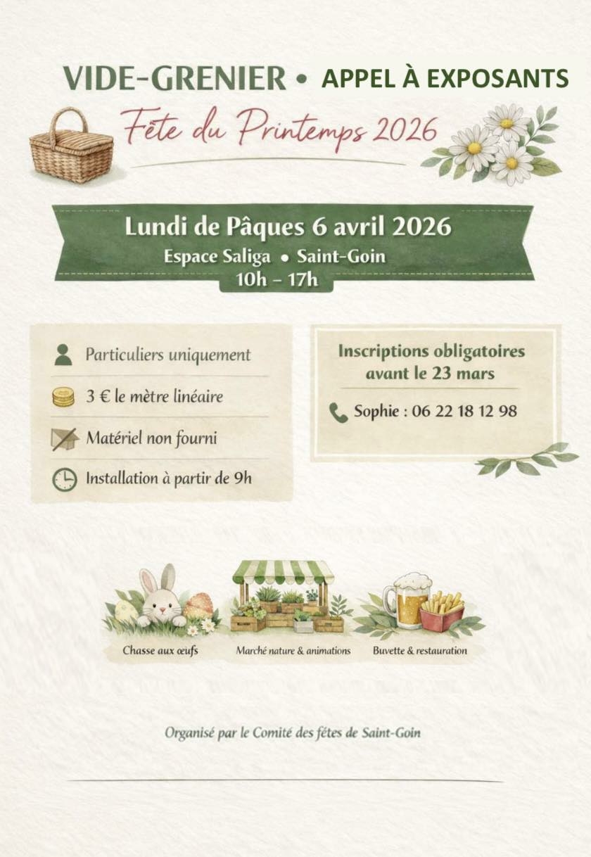 Vide grenier organisé par le comité des fêtes de Saint-Goin. Particuliers uniquement.