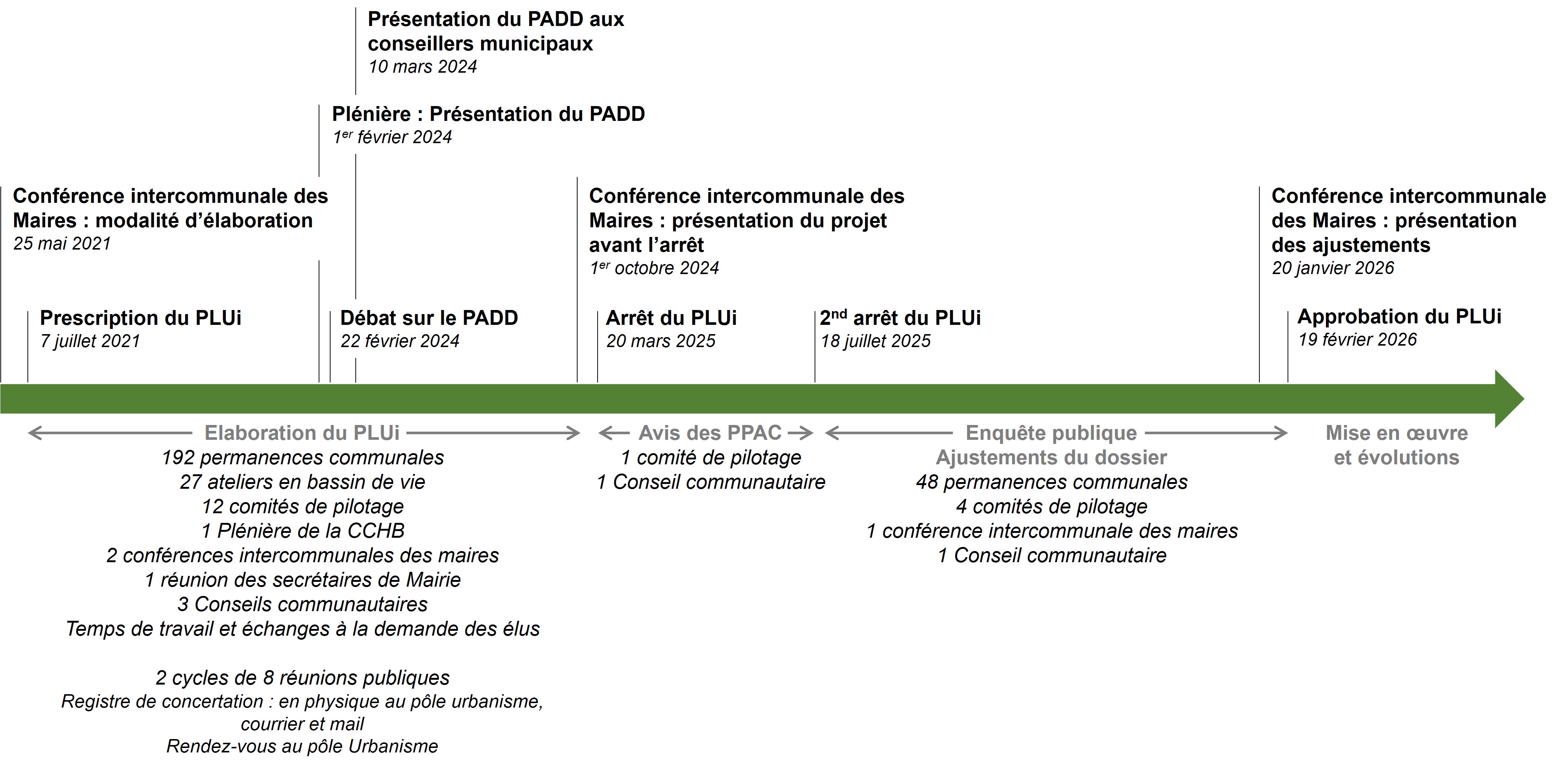 À la suite du 1er arrêt du PLUi, le dossier a été soumis pour avis aux personnes publiques et associées et consultées (PPA.C) et aux 48 communes membres de la CCHB